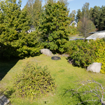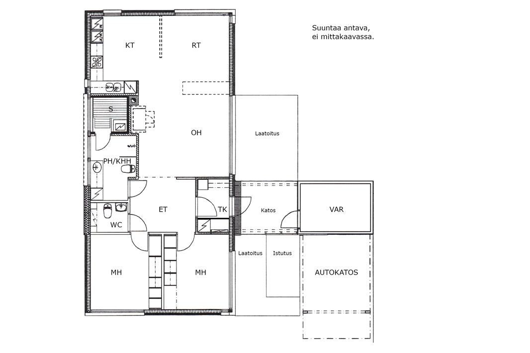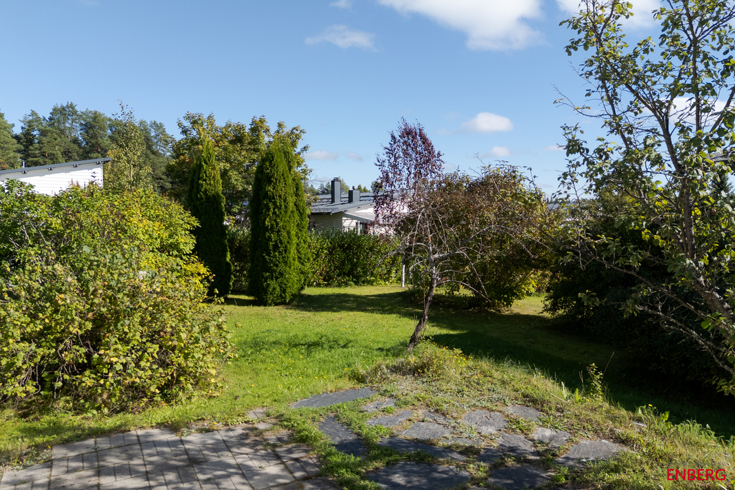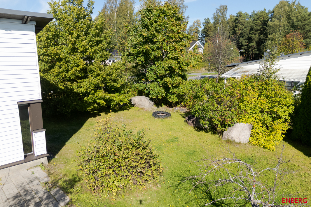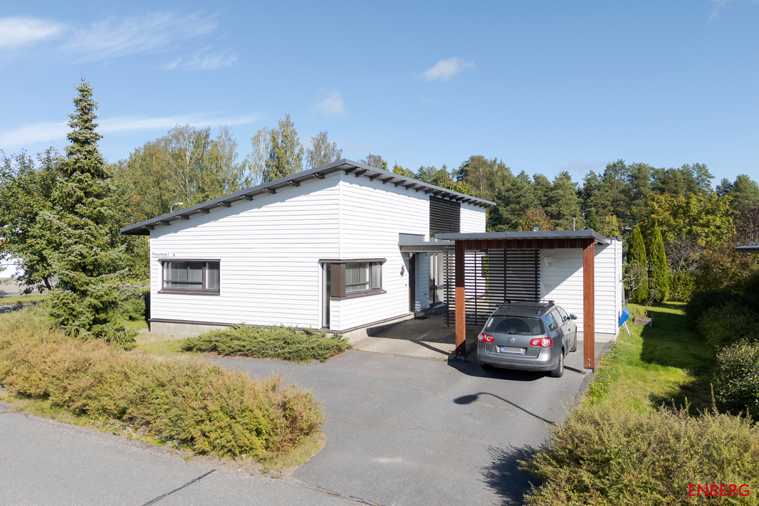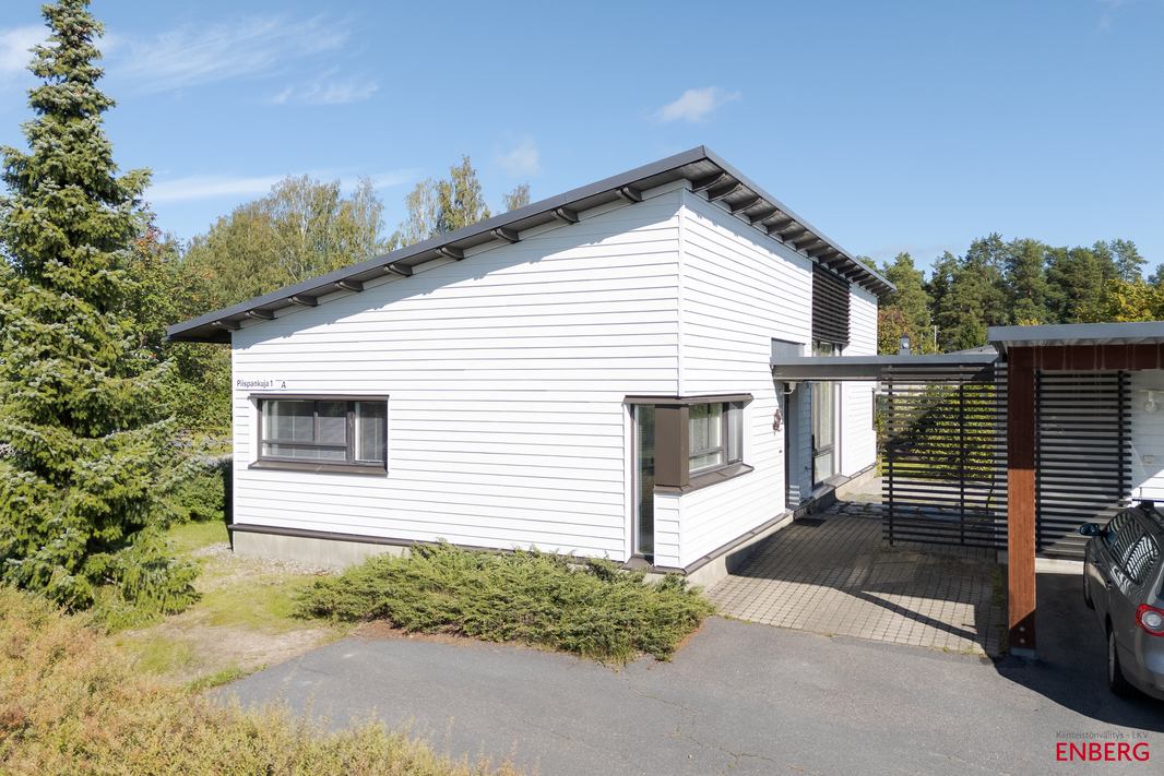 Sisääntulon yhteydessä on autokatos ja sen perällä varasto. Pihassa on lisää parkkitilaa. Piha-alue on pääosin nurmetettu ja osin laatoitettu – helppohoitoinen kokonaisuus, joka antaa mahdollisuuksia sekä lasten leikkeihin että aikuisten oleskeluun.
