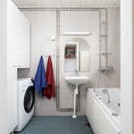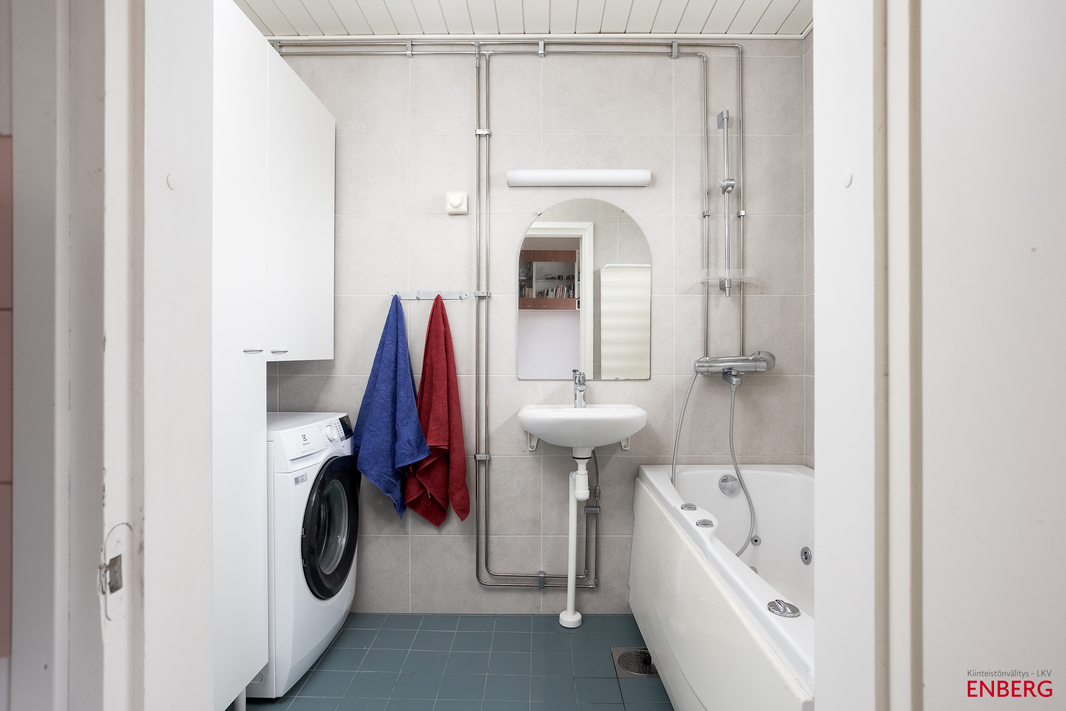 Vuonna 2024 uusittu kylpyhuone tarjoaa arkeen luksusta poreammeen kera. Lisäksi asunnossa on erillinen WC. Keittiö on siisti ja avara ja siellä on runsaasti työskentely-, sekä säilytystilaa.