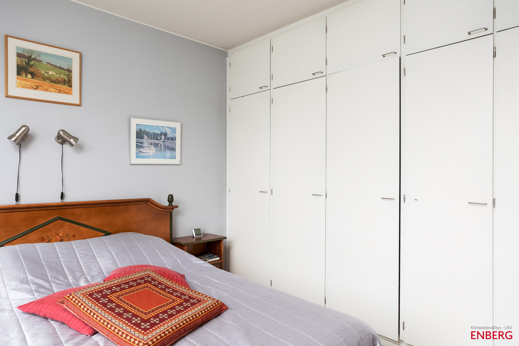 Eteisestä avautuu näkymä olohuoneeseen, erillisen keittiön ohi. Kodissa on kaksi makuuhuonetta: toinen rauhallisen etupihan suuntaan runsaalla kaappitilalla ja toinen takapihan puolelle. Tilava olohuone kutsuu viihtymään – saarniparketti tuo lämpöä sisustukseen ja huoneesta on käynti lasitetulle parvekkeelle. Säilytystilaa löytyy runsaasti erillisen vaatehuoneen ansiosta.