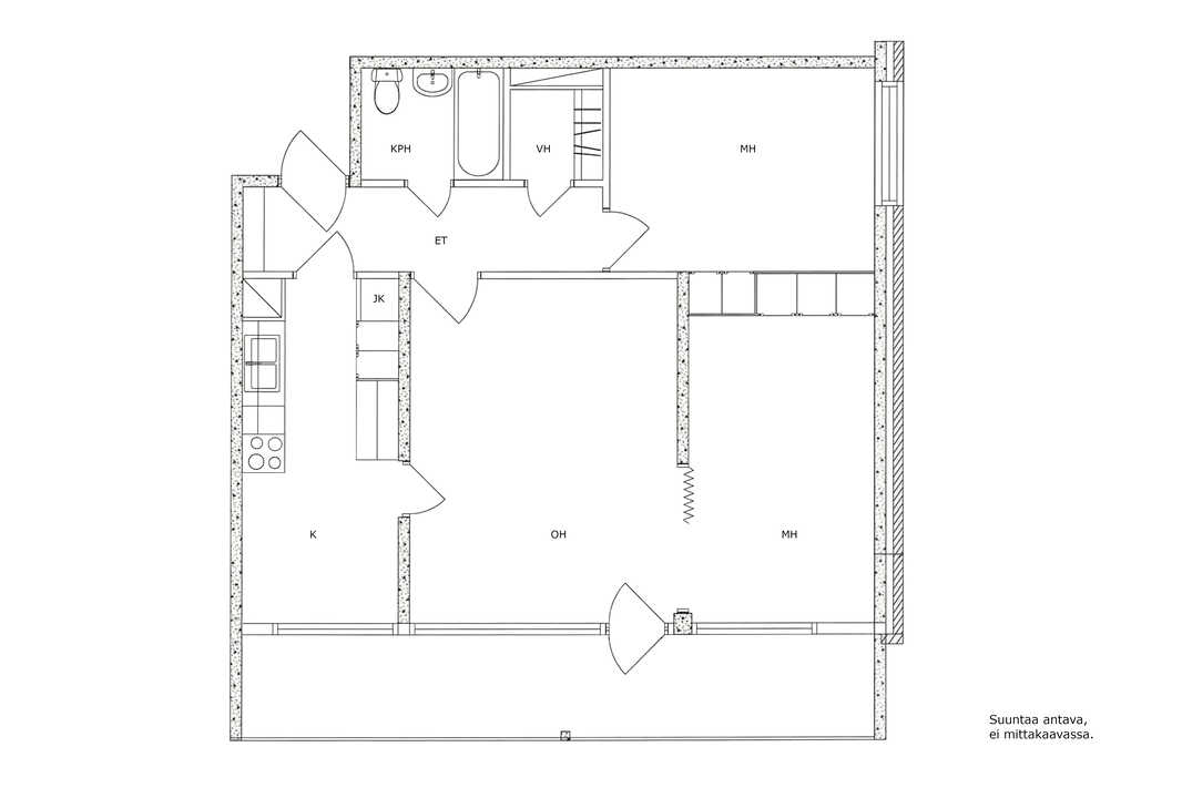 Asunnossa on kaksi makuuhuonetta, keittiö ruokailutiloineen, kylpyhuone sekä vaatehuone, joka tuo mukavasti lisäsäilytystilaa. Pohjaratkaisu on toimiva ja neliöt on käytetty tehokkaasti.