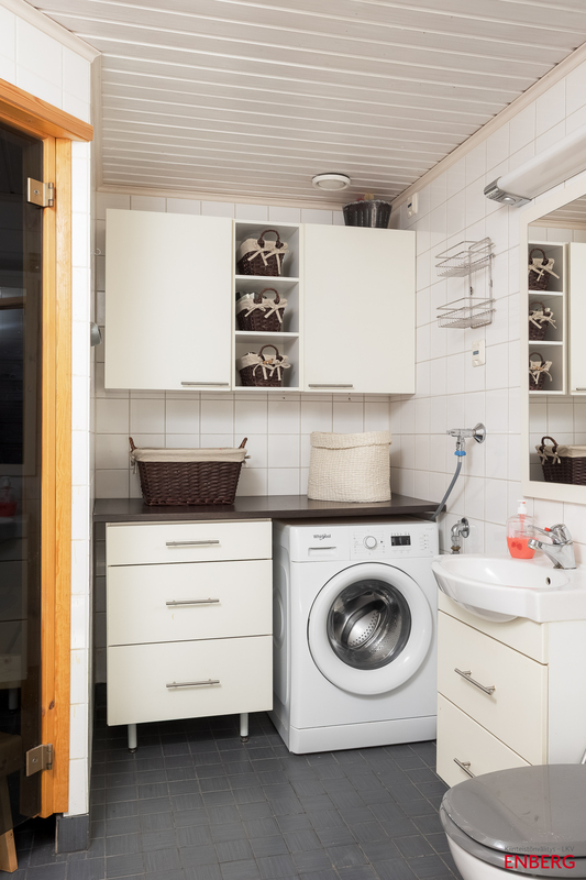 Alakerrassa sijaitsee avara olohuone ja keittiö, jotka muodostavat yhtenäisen ja viihtyisän oleskelutilan. Olohuoneesta on käynti omalle suojaisalle terassille, joka tarjoaa mukavan paikan kesäpäivien viettoon. Alakerrasta löytyvät myös eteinen sekä oma sauna pesutiloineen.