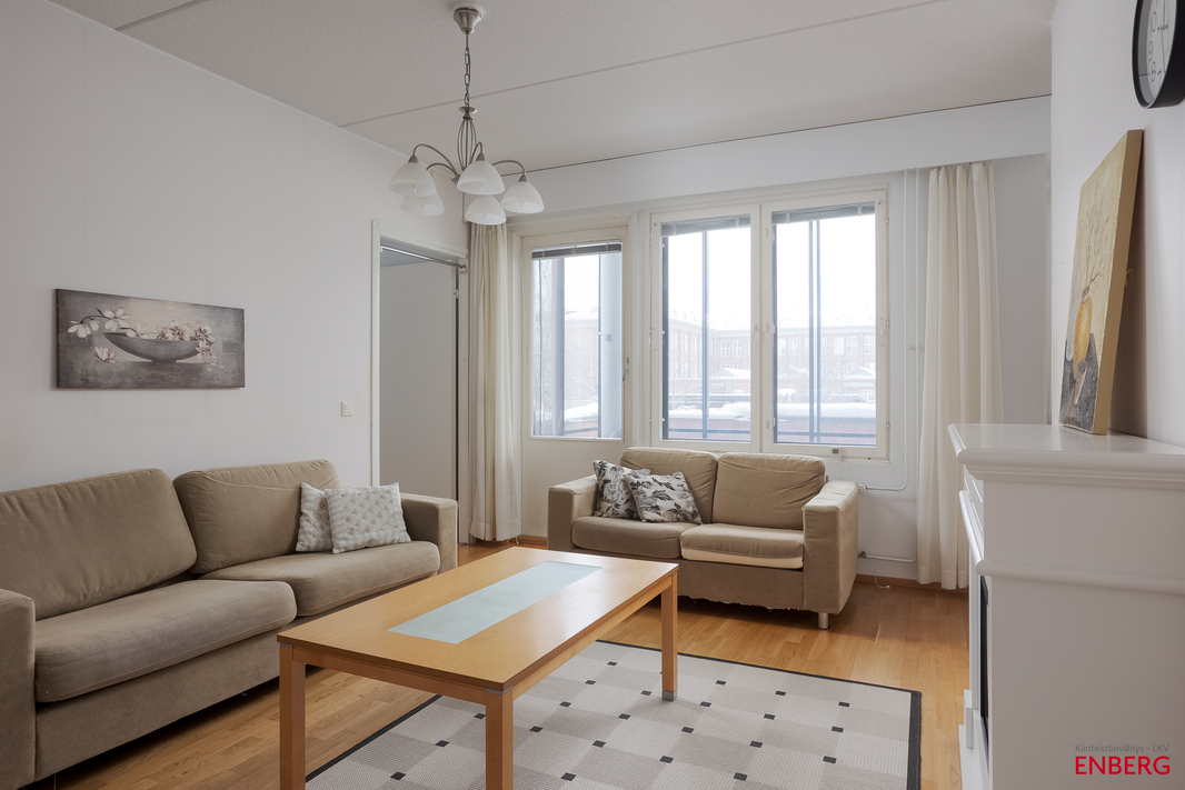 Siistikuntoinen kolmio uudehkossa talossa Tourulassa. Rauhallinen sijainti pihan puolella. Esteetön kulku maantasalla sijaitsevaan huoneistoon.