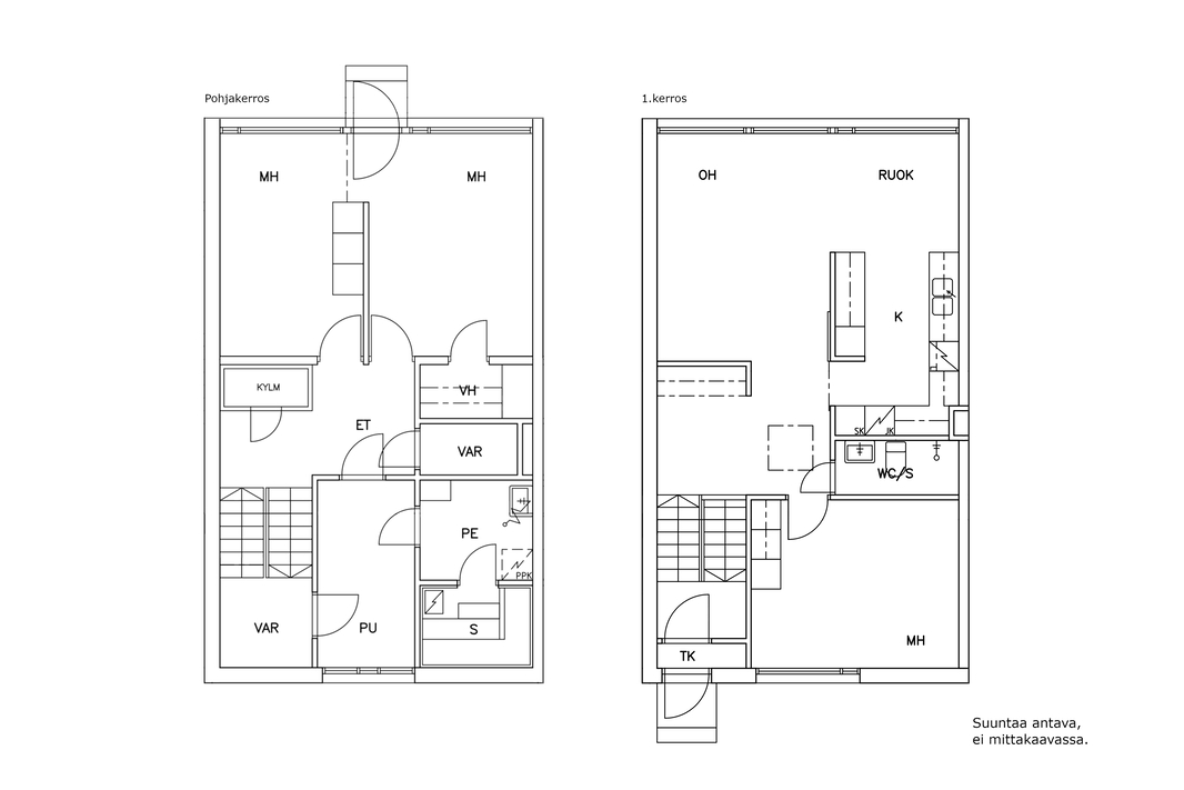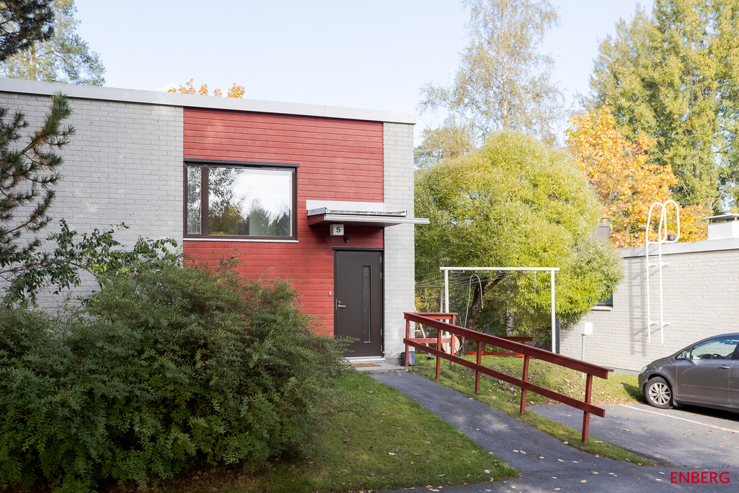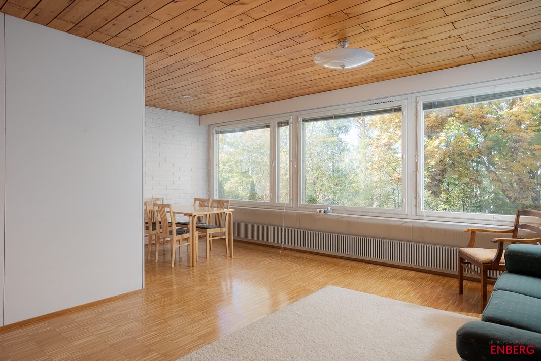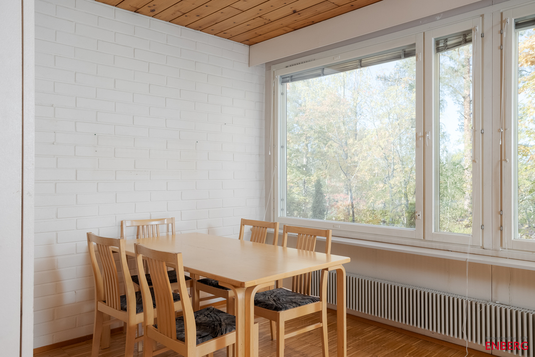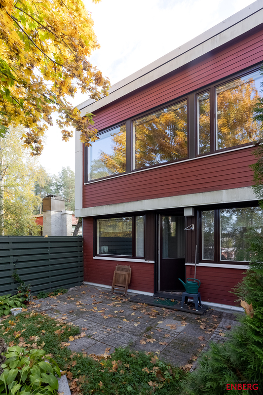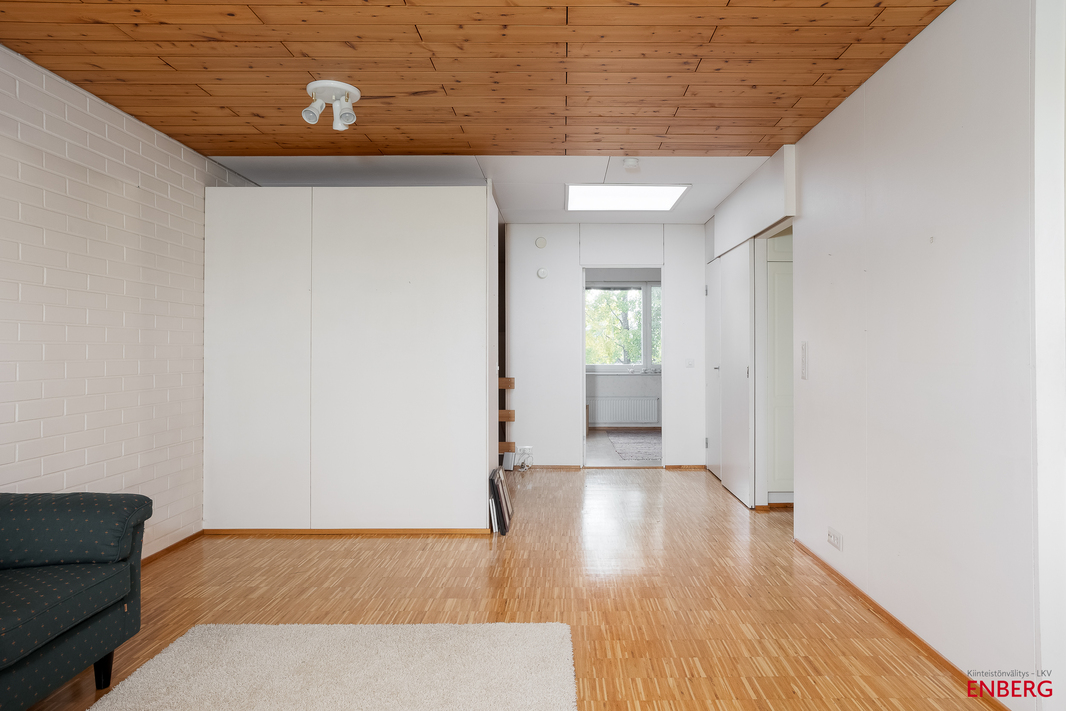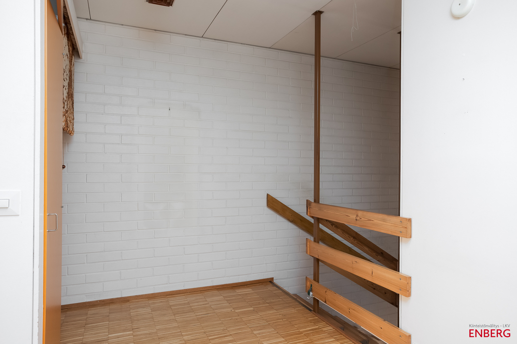Asunto on pääosin alkuperäiskuntoinen eli erinomainen mahdollisuus päivittää pintojen ja materiaalien osalta oman maun mukaiseksi. Yläkerrassa on valoisa olohuoneen, ruokailutilan ja keittiön kokonaisuus sekä yksi makuuhuone ja wc. Alakerrassa sijaitsevat kaksi makuuhuonetta, saunaosasto pukuhuoneineen sekä kodinhoitotila, josta on käynti ulos. Kaksi wc:tä ja runsaasti säilytystilaa lisäävät asumismukavuutta.