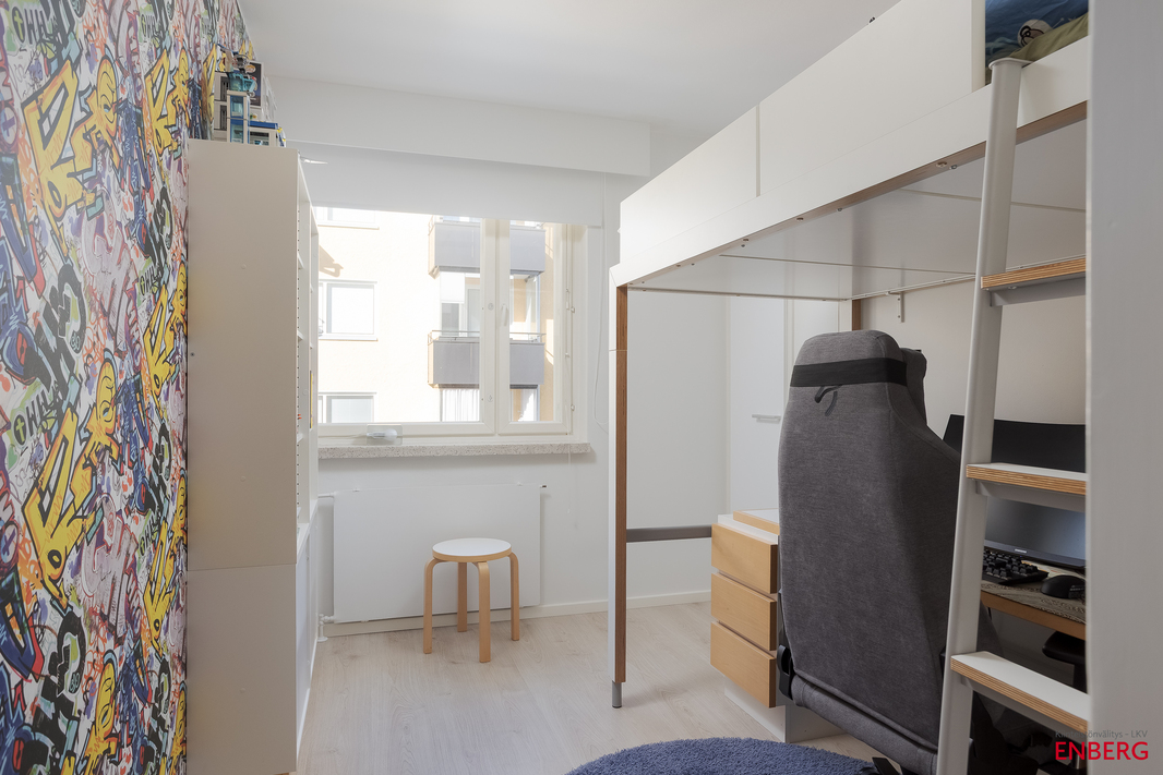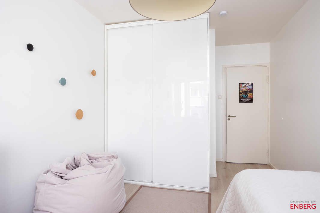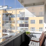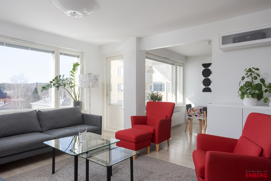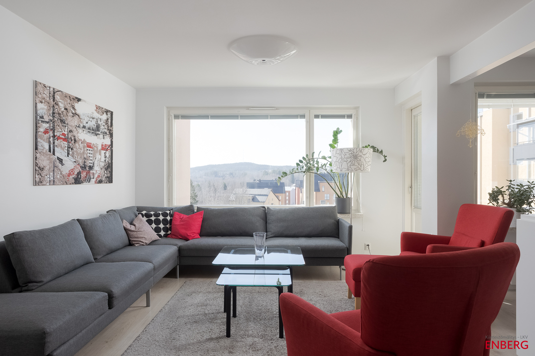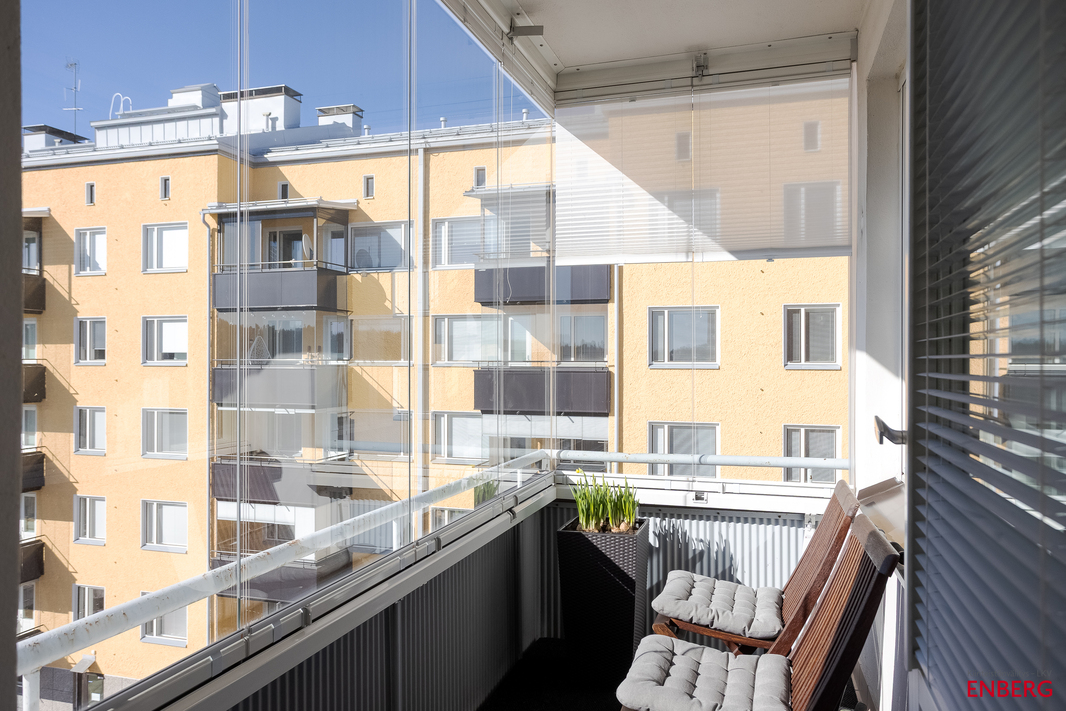 Neljännen kerroksen korkeus ja olohuoneen suuret ikkunat takaavat hienot, avarat näkymät, jotka tuovat kotiin runsaasti luonnonvaloa. Lasitettu parveke lisää asuinmukavuutta ja paikan nauttia ulkoilmasta omassa rauhassa.
