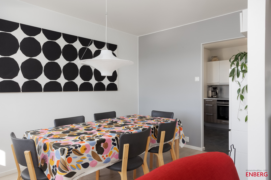 Asunnossa on kolme makuuhuonetta, olohuone ja keittiö, lisäksi erillinen ruokailutila tuo ripauksen arjen luksusta ja tilaa yhteisille illallisille.