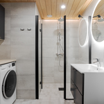 Vuonna 2021 täysin remontoitu kylpyhuone on toteutettu tyylikkäillä materiaaleilla – täällä silmä lepää.