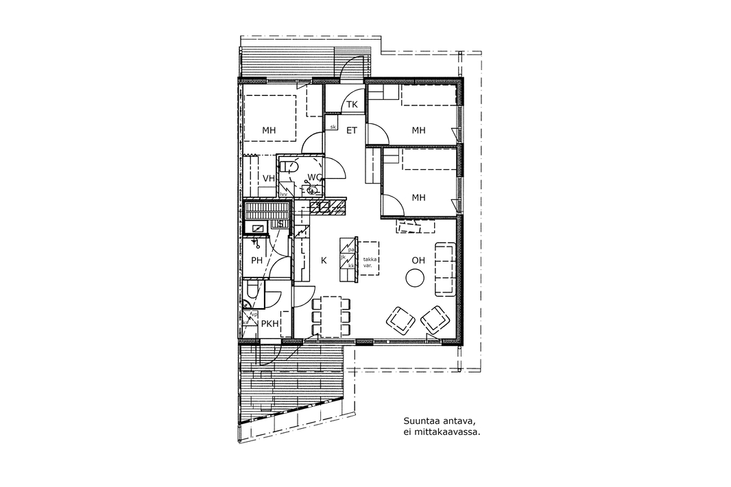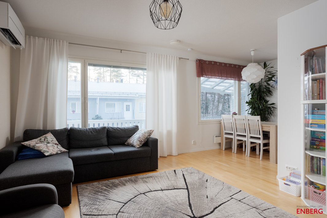 Olohuone ja keittiö muodostavat toimivan, yhtenäisen kokonaisuuden, ja kolme makuuhuonetta tuovat hyvin tilaa niin perheelle, etätyölle kuin harrastuksille. Kylpyhuone ja oma sauna ovat siistissä kunnossa, ja säilytystilaa löytyy arjen tarpeisiin.