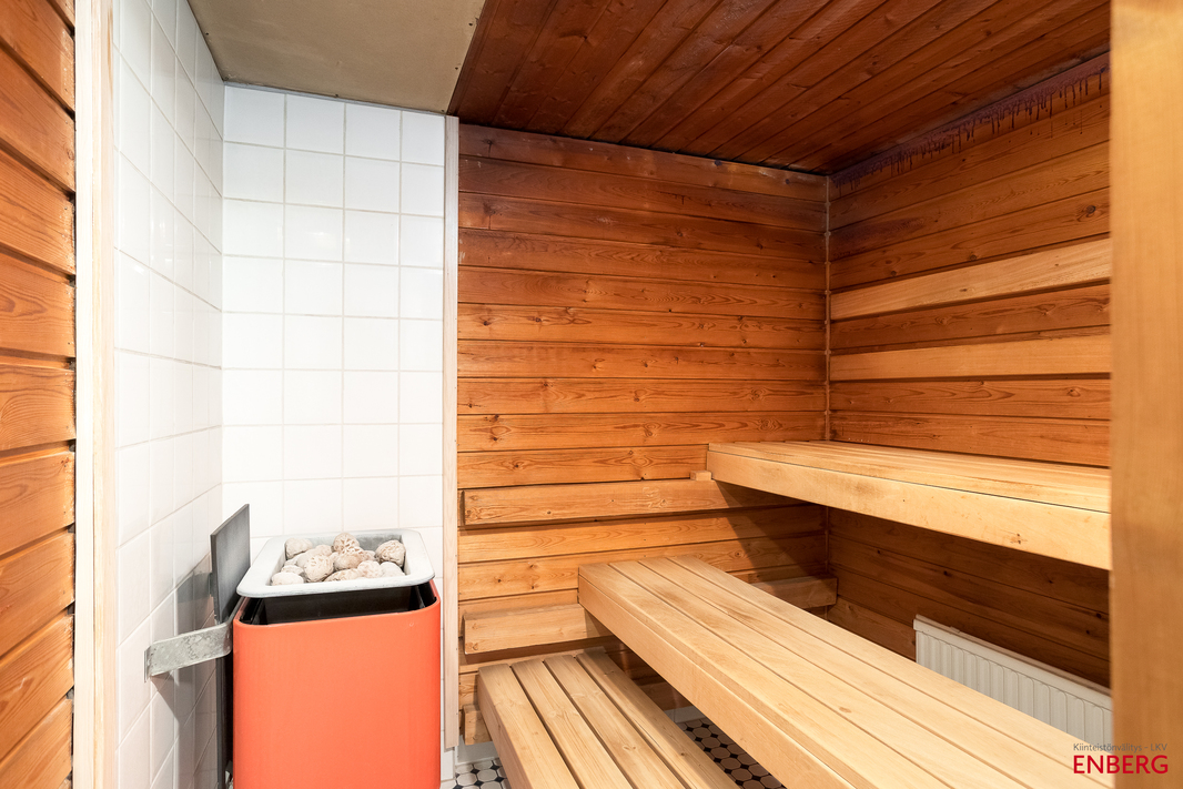 Alakerrassa, sisääntulon yhteydessä on tuulikaappi, varasto-/vaatehuonetiloja ja eteisaula, sekä kylmiö. Lisäksi alakerrasta löytyy kaksi tilavaa makuuhuonetta, pukuhuone, kodinhoitotila, kylpyhuone ja sauna sähkökiukaalla.