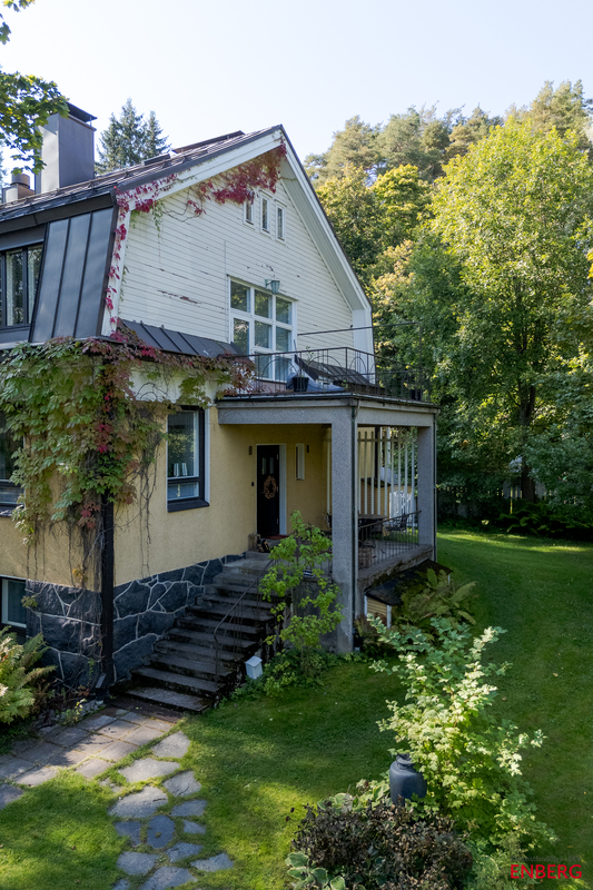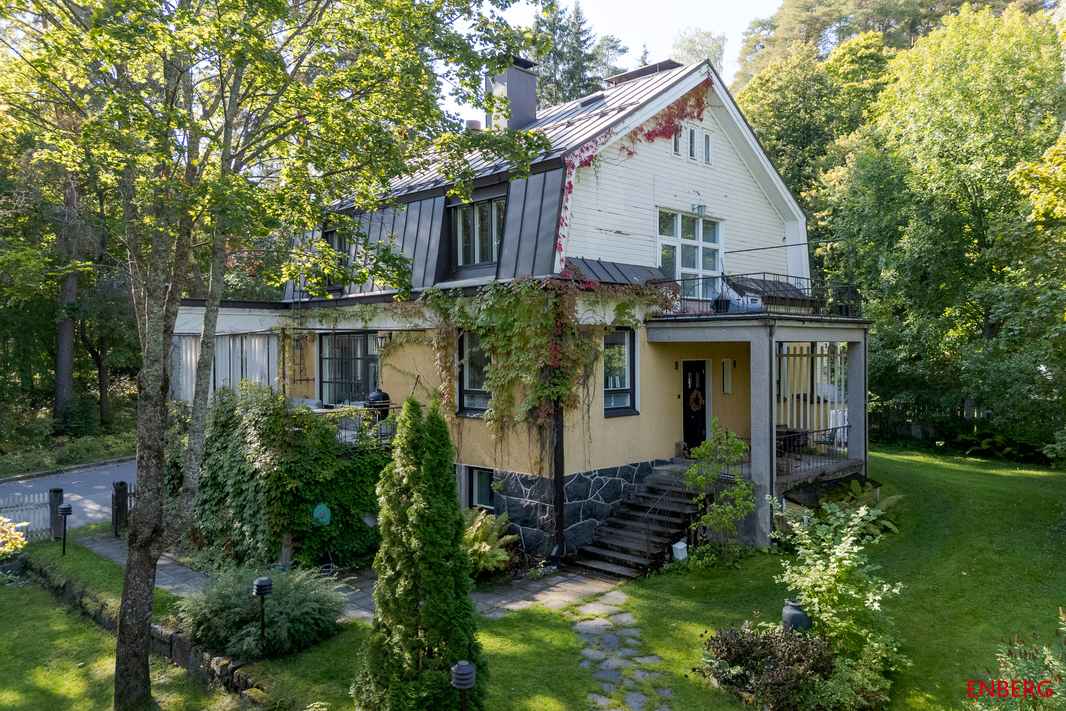 Harmaakivinen, tiilinen ja hirsirakenteinen rakennus ilahduttaa erkkeri-ikkunoillaan ja sisäänvedetyllä ullakkokerroksellaan, jotka antavat rakennukselle persoonallisen ja moniulotteisen ilmeen. Erityistä kiinnostusta herättää myös 1950-luvulla rakennettu autotalli kellarissa sekä sen päälle sijoitettu avokuisti. Leveä ulkoportaikko johdattaa talon sisäänkäynnille.