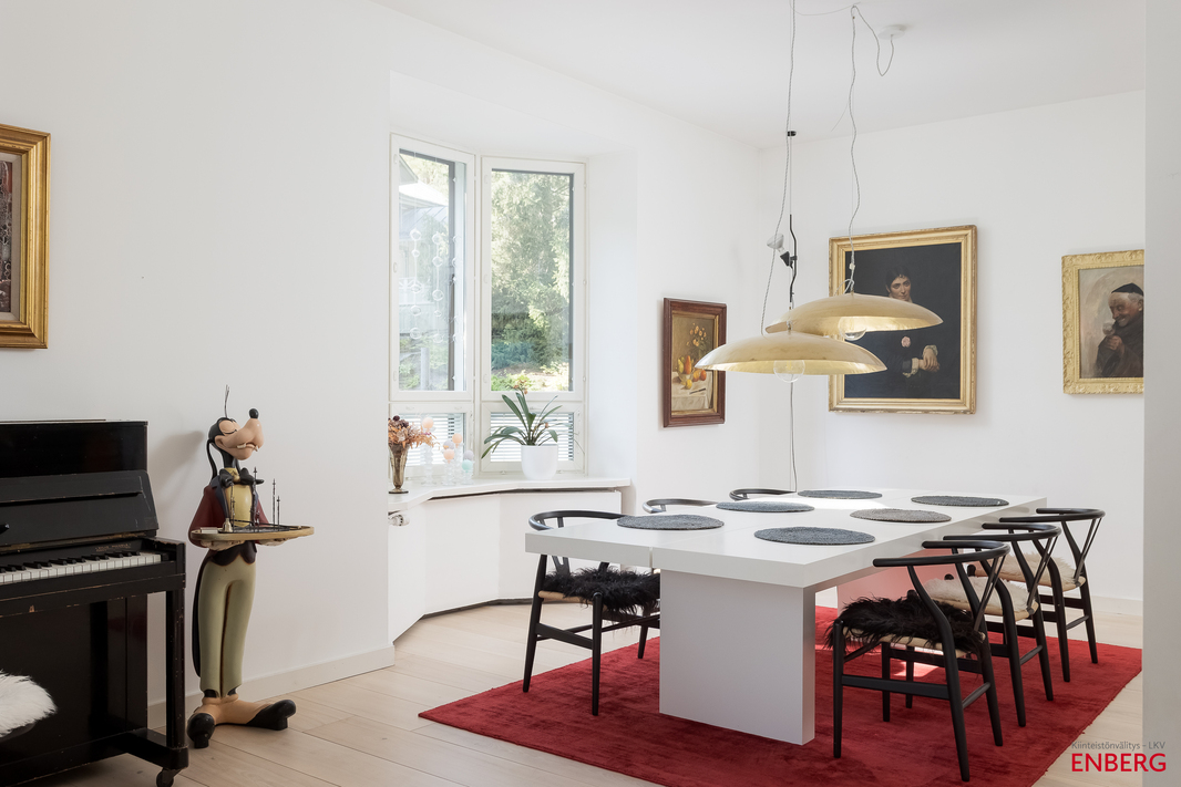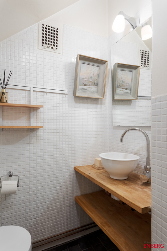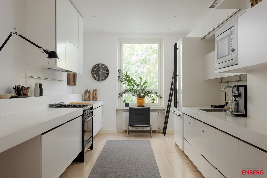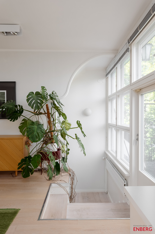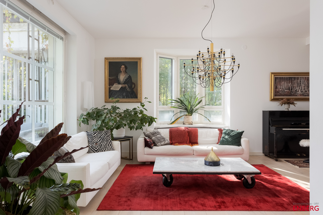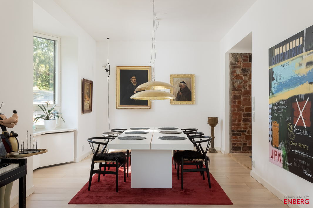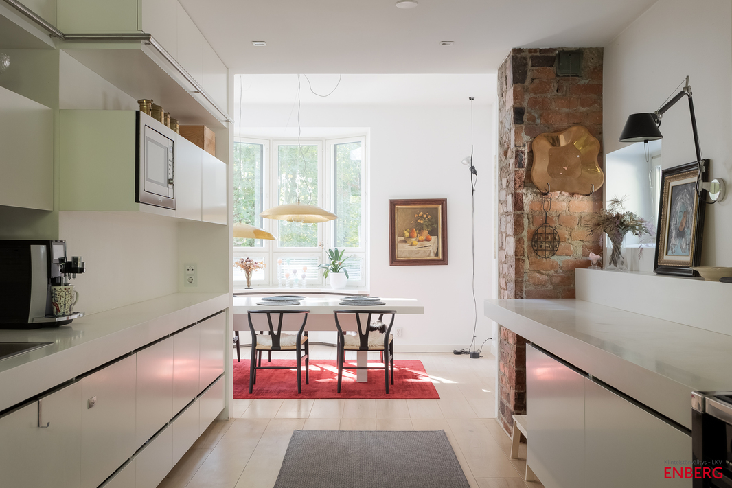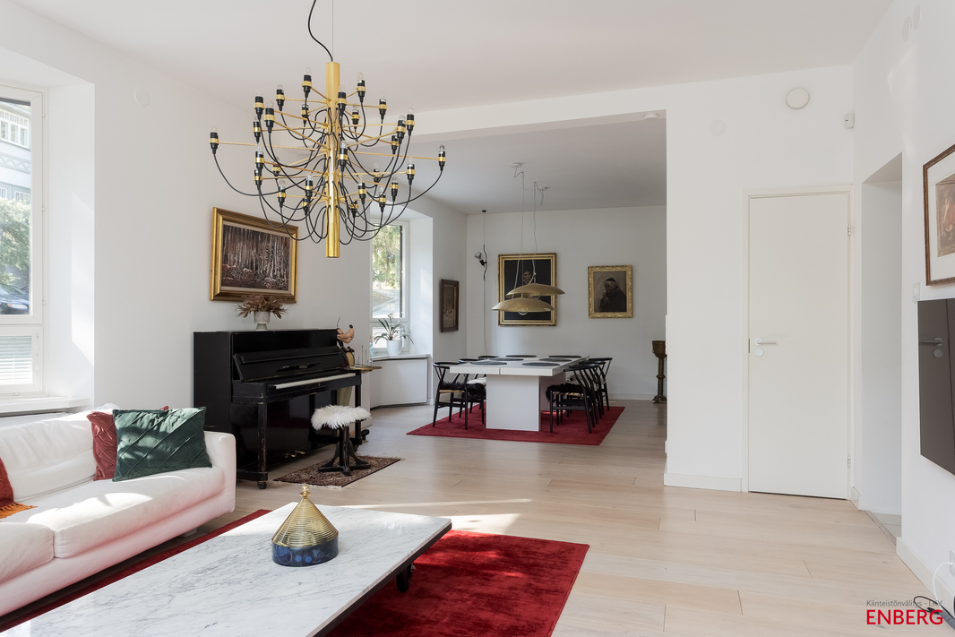 Rakennusta on viime vuosina remontoitu tyylillä ja laatua arvostaen. Erkkeri-ikkunoin varustettu olohuone kylpee luonnonvalossa ja tekee vaikutuksen ensi askeleilla. Keittiö on saanut uuden ilmeen mittatilauksena valmistetuista puusepän kaapistoista, Corian-työtasoista, tiiliseinästä sekä korkeatasoisista kodinkoneista – kruununa Smegin kuuden kaasupolttimen liesi, joka luo täydelliset puitteet intohimoiselle ruoanlaitolle.