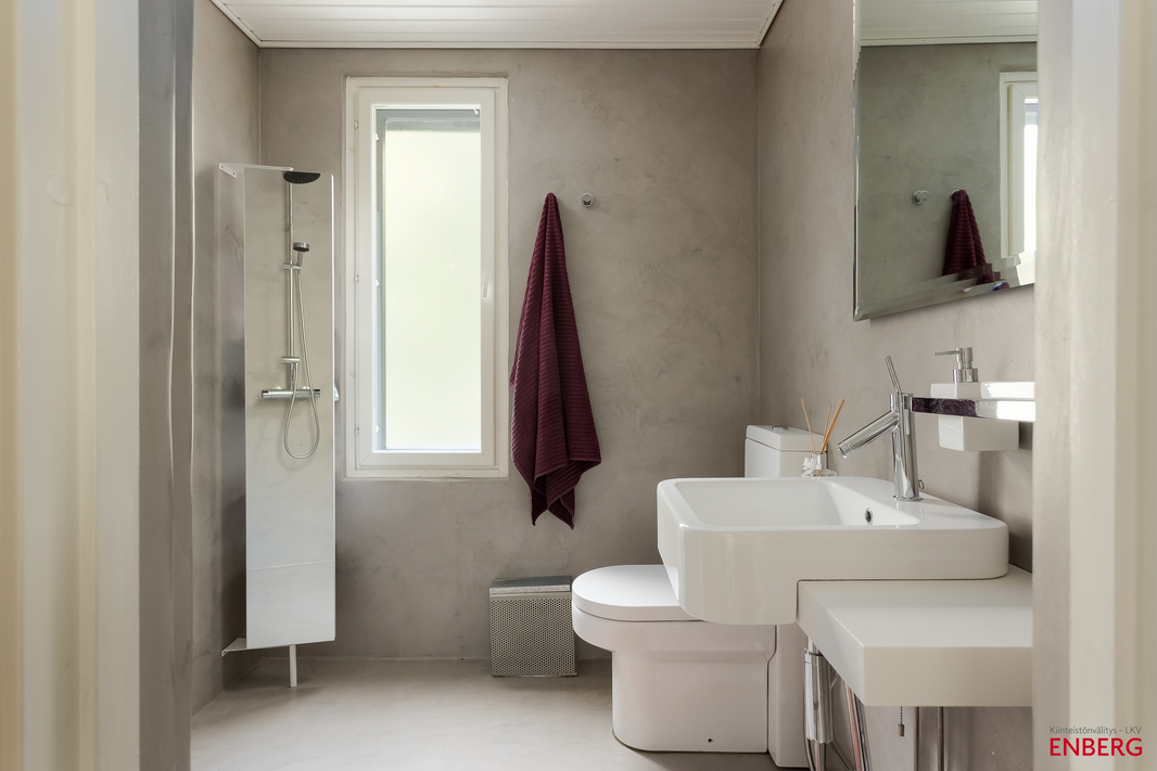 Kylpyhuoneen kuvaus | Yläkerran kylpyhuone remontoitu vuonna 2012 asentamalla mikrosementtipinnoite laattojen päälle. Pesuhuoneen seiniin ja lattiaan sekä saunan lattiaan asennettu mikrosementtipinnoite, pesuhuoneen vesisekoittimet sekä valaistus uusittu 2013. Muurattu, lämmitetty amme. Vesikiertoinen lattialämmitys. Saunan puuosat maalattu ja saunan kiuas-seinä rapattu sekä kiuas uusittu 2012. |
