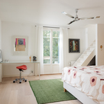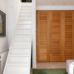 Makuuhuoneen kuvaus | Makuuhuoneen komeron ovet, eteisen keskikerroksen kaapit ja yläkerran pikkuhuoneen ovi ja hyllyt teetetty puusepällä 2013. |
